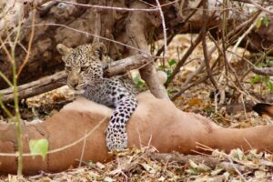Birders will be pleasantly rewarded with sightings of many species occurring in this camp’s habitat: Meyer’s Parrot, Meve’s Starlings, Southern Black Tit, African Mourning Dove, African Scops-Owl visit all year and summer brings visitors like Broadbilled Roller, Eurasian Golden Oriole, Woodland Kingfisher and Levalliant’s Cuckoo. Raptors include Little Sparrowhawk and Gabar Goshawk.