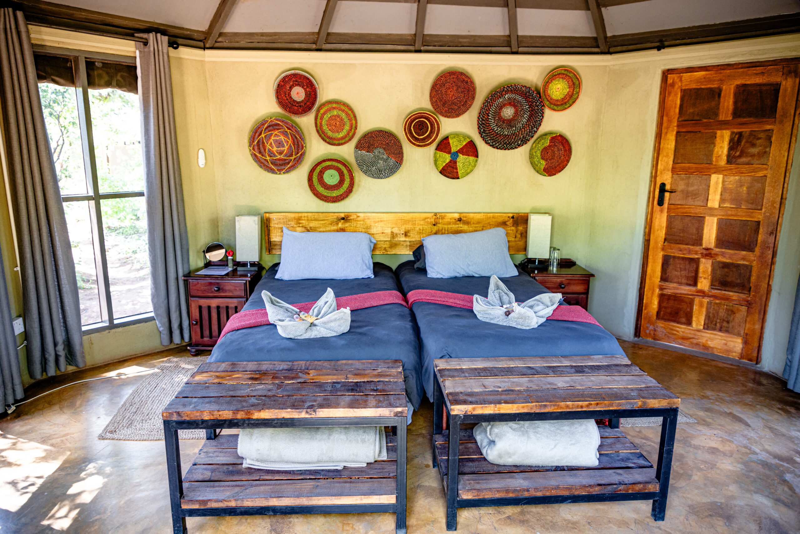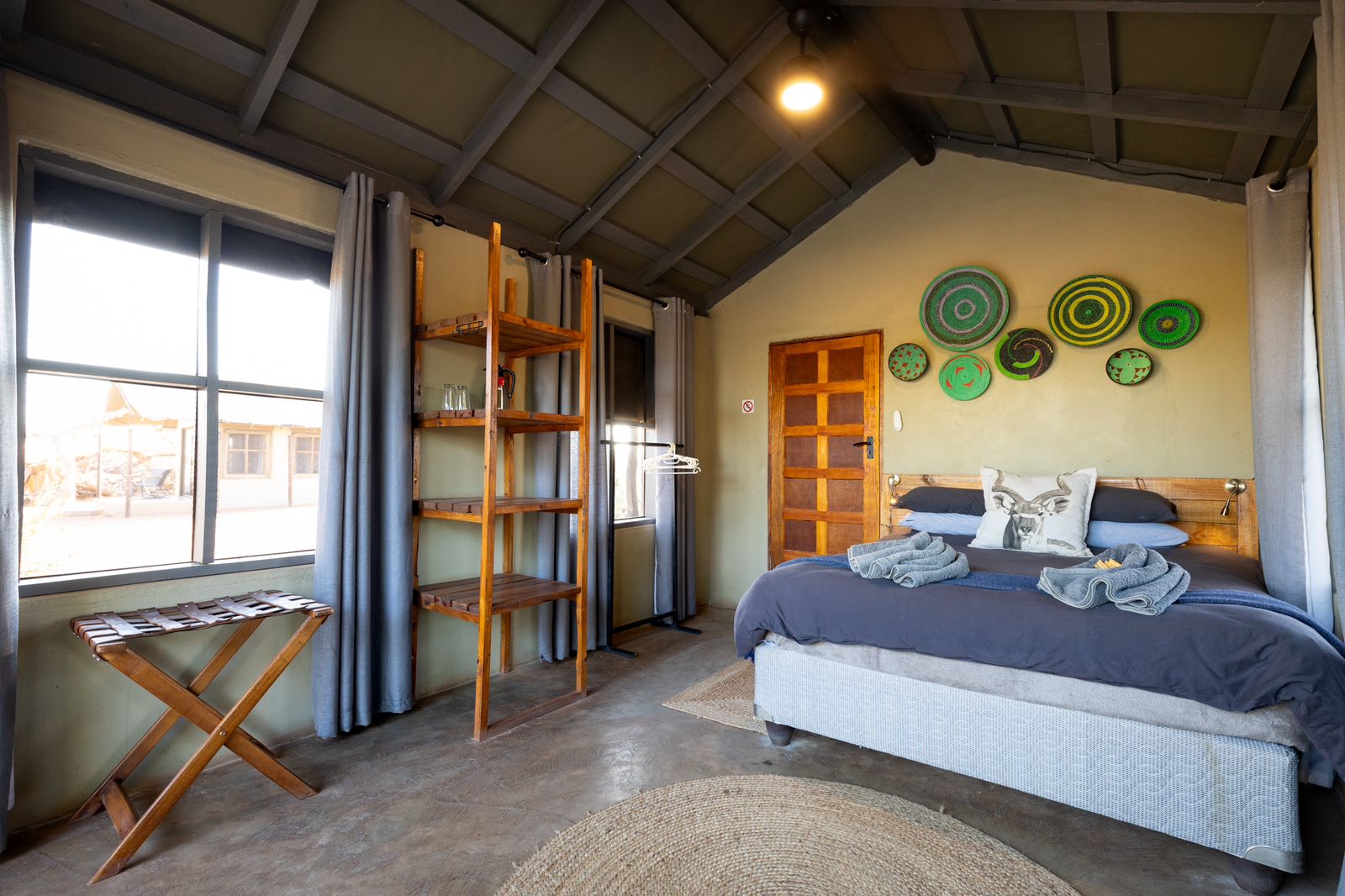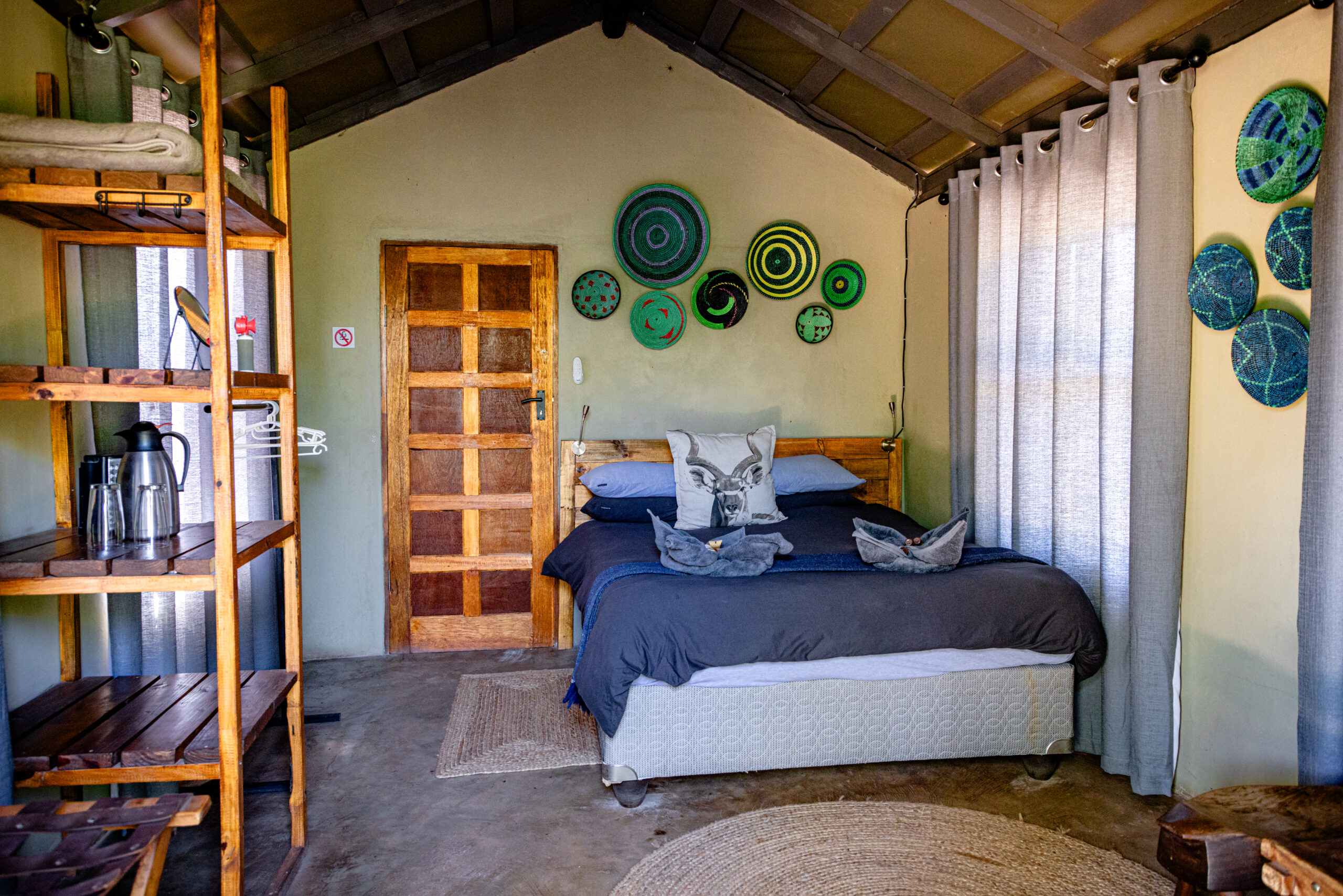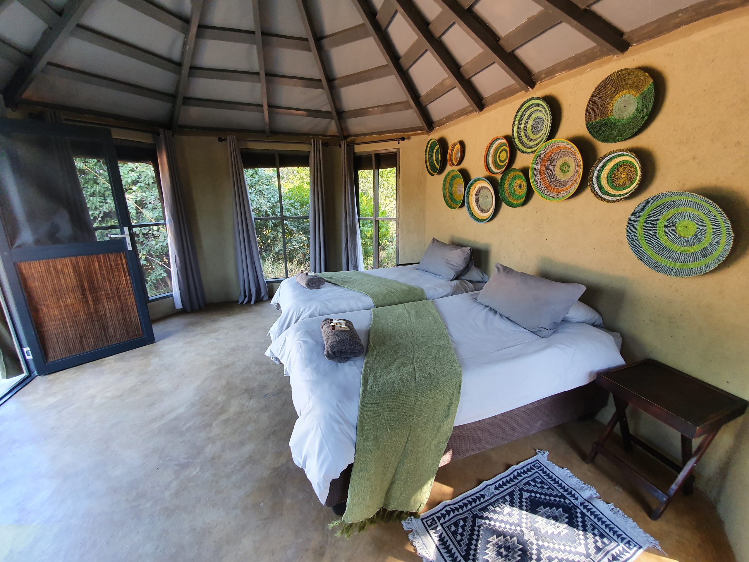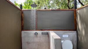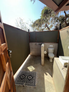 Two of the units are ‘tent-like’ with en-suite open-air ablutions and glass sliding doors allowing views of the bush, whilst the other 3 units are hut-shaped and have en-suite open-air ablutions. All rooms have a ceiling fan and an electric light.