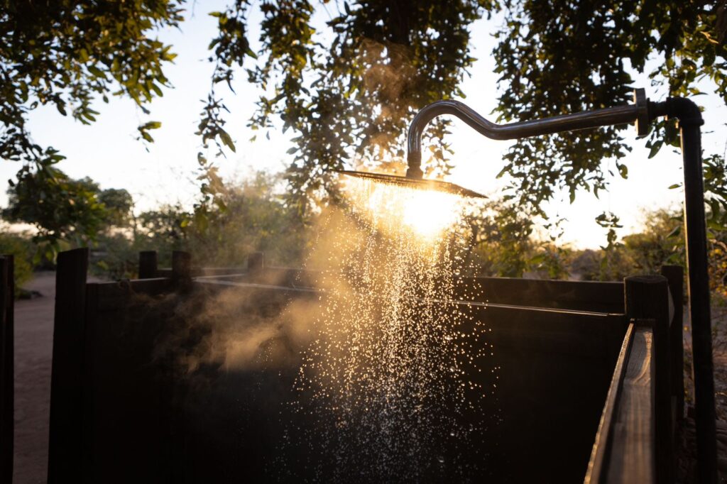 A solar system powers the camp with 220V electricity – there are electric fridges and freezers in the kitchen, and shower water is heated by a combination of gas geysers and donkey boilers.